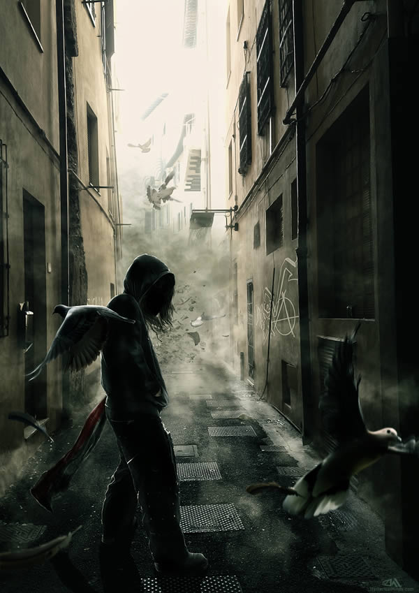 "Leaving hope" is a moving, atmospherical piece, surrounded by soft piano touches, but also a fight between light and dark, loneliness and existence. This was not the first time I created a conceptual work based on a Nine Inch Nails piece, trying to develop a concept without missing any of the details that music makes me feel. I always found in Leaving hope the feel of loneliness somebody has when, tired of everything, needs to give up. I tried to take it to my field of work, fantastic dreamlike places where in soft ways the most painful feelings are expressed.  Impersonating human challenges and vital goals into folded paper birds, I’ve worked in an installation of 2×3 metres where birds hung from ceiling, surrounding an individual who holds a melting black bird: a hope that is becoming darker for moments. Working with digital photography helped to work in different exposures which were assembled in post processing, as color and focus adjustments.