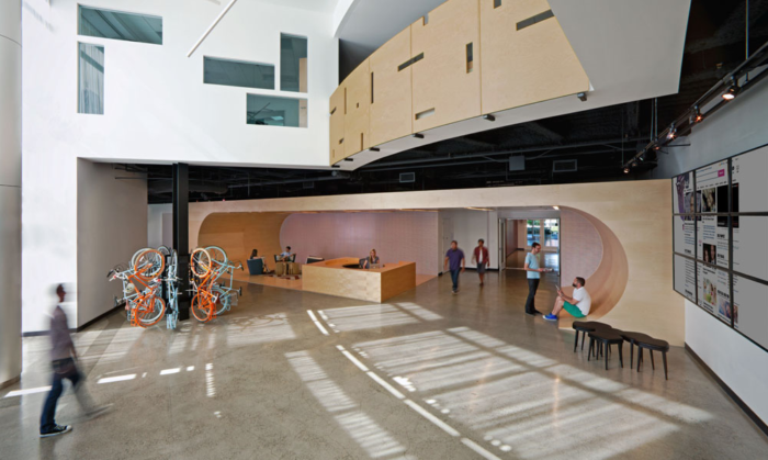 The first floor’s plan – crafted by Studio 0+a – was designed to turn previously unused and unneeded space into a vibrant and energetic “campus” area that builds community and fosters interaction.